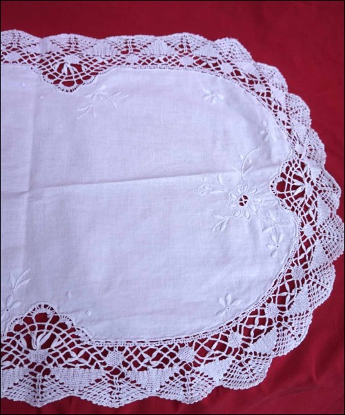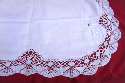 Centre de table brodé et orné de dentelles. Longueur 120 cm, largeur 35 cm. Très bel état.