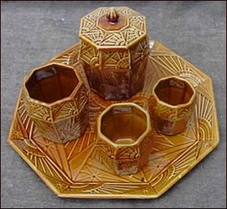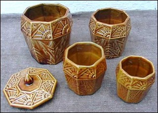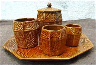 Service de fumeur "Art Déco" de la faïencerie de Onnaing bans le nord de la France, vers 1930-35. Les quatre pots sont signés sur le fond. Seul le pot à tabac a une grenure sur le bord et un accident sur un angle du couvercle. Dimensions pour le plateau 27 cm largeur et pour le pot à couvercle hauteur 12 cm largeur 10 cm.