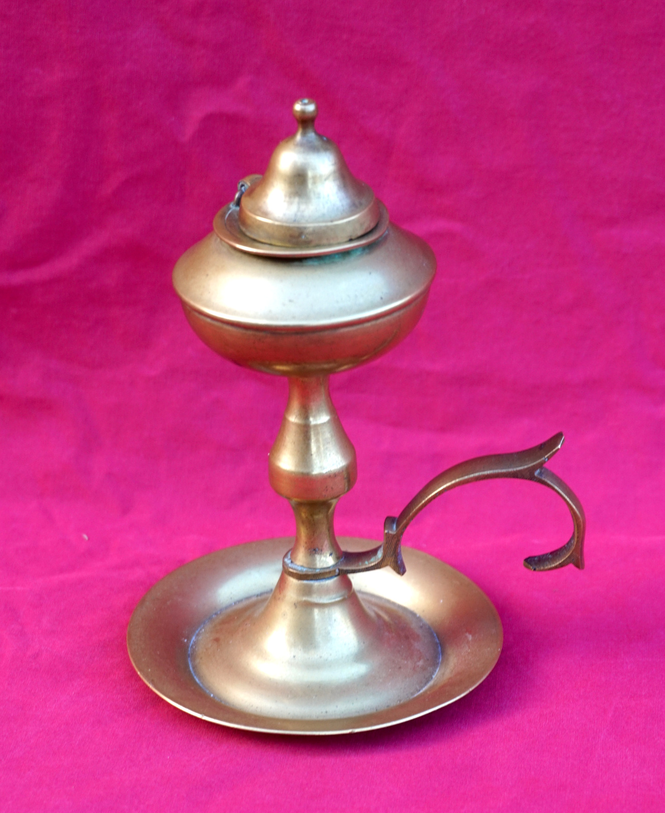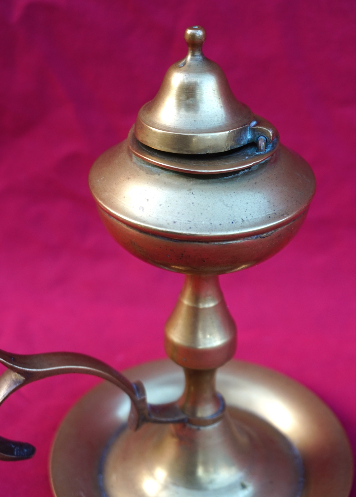 British Raj brass cigar Table lighter oil lamp made early 20th century. 6 1/8" (15.5cm) height, 4 1/4" (11cm) width with the handle. Beautiful condition the burner and the lid are slightly twisted as shown by the following pictures.