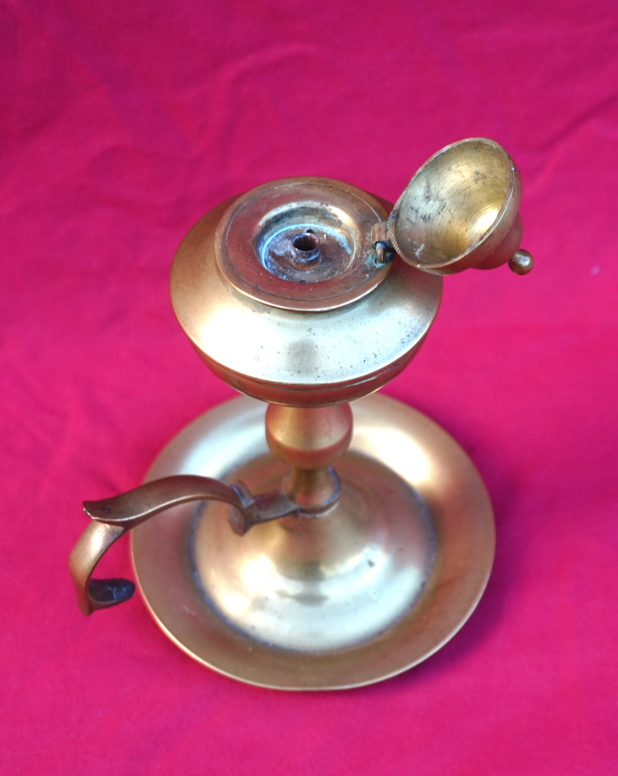 Petite lampe à huile briquet de table en laiton, début XX° siècle. Hauteur 15.5 cm, largeur avec la poignée 11 cm. Très bel état.