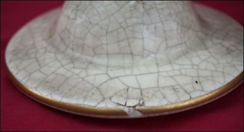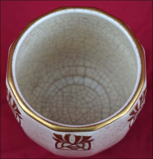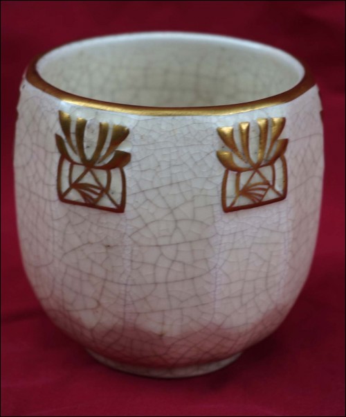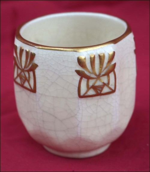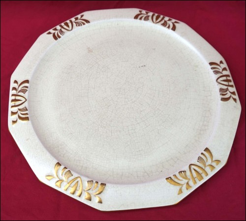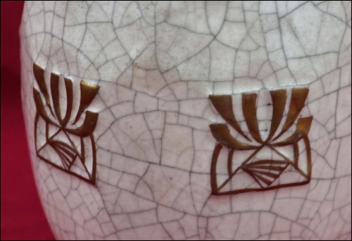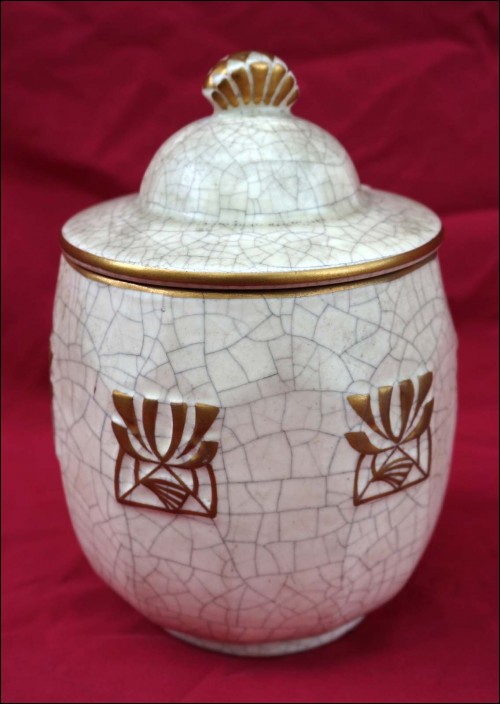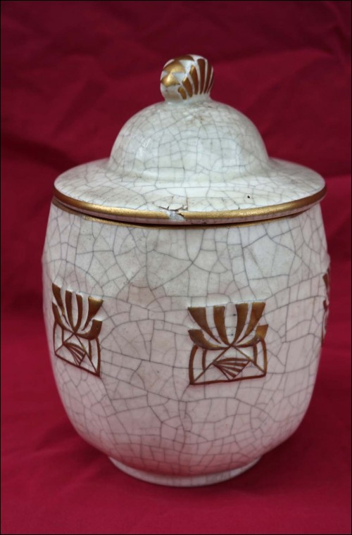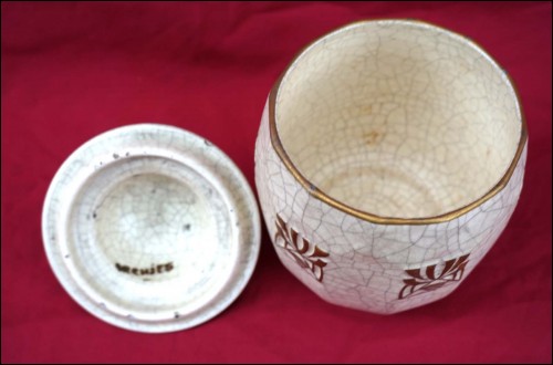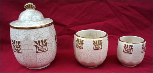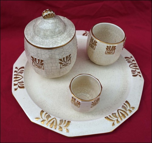 Belgium gilt crackeled faience tobacco set including : dish, lidded tobacco jar and 2 pots, made by Emile L'Hermine Declerq and his brother in Orchies during the 1880"s Secessionist period. All parts are signed with the mark of the beggining of the factory. 12 3/8" (32cm) diameter for the tray and 6 1/2" (16,5cm) height for the tobacco jar. Good condition only the lid has a small damage on the edge as shown by the following pictures.