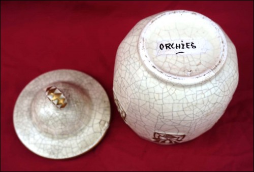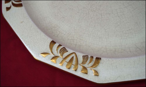 Partie de service à tabac en barbotine craquelé et décors dorés sécessionniste de la manufacture d'Orchies par Emile L'Herminé Declercq et son frère vers 1890. Rare signature des débuts de la manufacture. Bel état, accident au couvercle. Hauteur du pot à tabac 16,5 cm, diamètre du plat 32 cm.