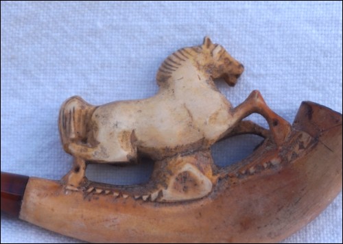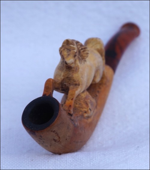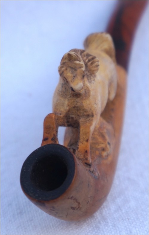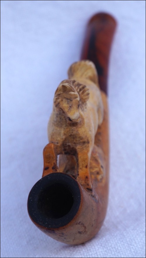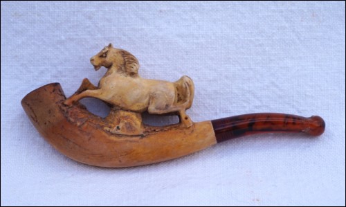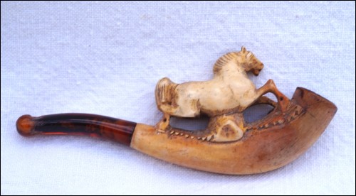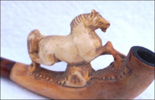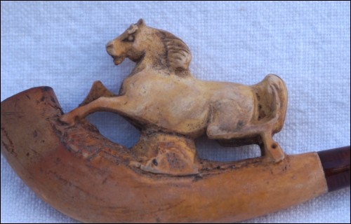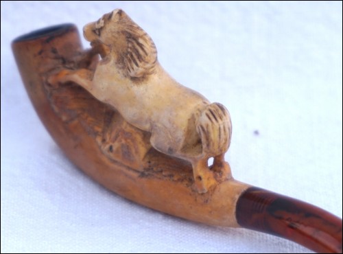 Victorian carved meerschaum pipe cigarette holder showing horse with its original case made late 19th century.3 1/2" (8.9cm) length, 1 1/2" (3.8cm) height. Good condition, the case is used as shown by the following pictures.
