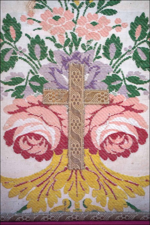 Burse in brocade with flowers and gold braid for the Catholic mass. 11 3/8" (29cm) height by 9 1/4" (23.5cm) width. Good condition , a few small stains and used as shown by the following pictures.