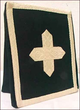 Burse in black cotton with cross and edge in white silk braid. Good condition. 10" by 8"1/2