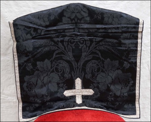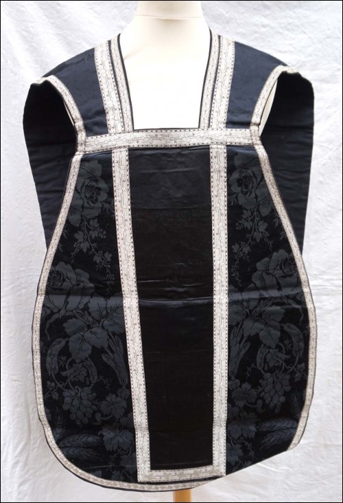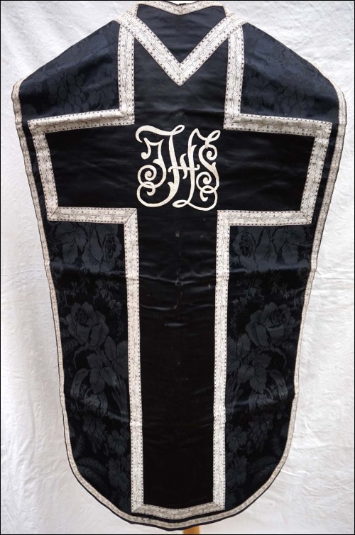 Chasuble with its cover chalice in black damask silk with silvered braid. On the back a cross in self-colored Croix with IHS silvered embroidery surrounded by silvered braid, in front the same braid pattern. 42 1/4" height, 25 1/2" width. Good condition some used in the silk as shown by the following pictures.