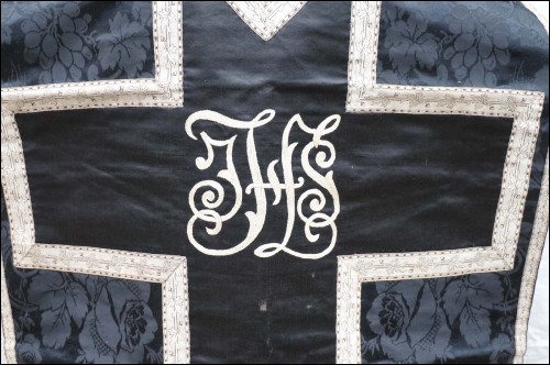 Chasuble violon avec son voile de calice en soie damassée noire rehaussée de galon en soie argenté et dans le dos IHS brodé argent dans la croix en soie unie bordé de galons. Bon état quelques usures dans la soie. Hauteur 107 cm, largeur 65 cm.