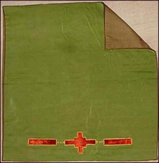 Cover chalice in green silk with red velvet silk inlayed and brown lining. Good condition. The stain is due to the picture. 19" by 19".