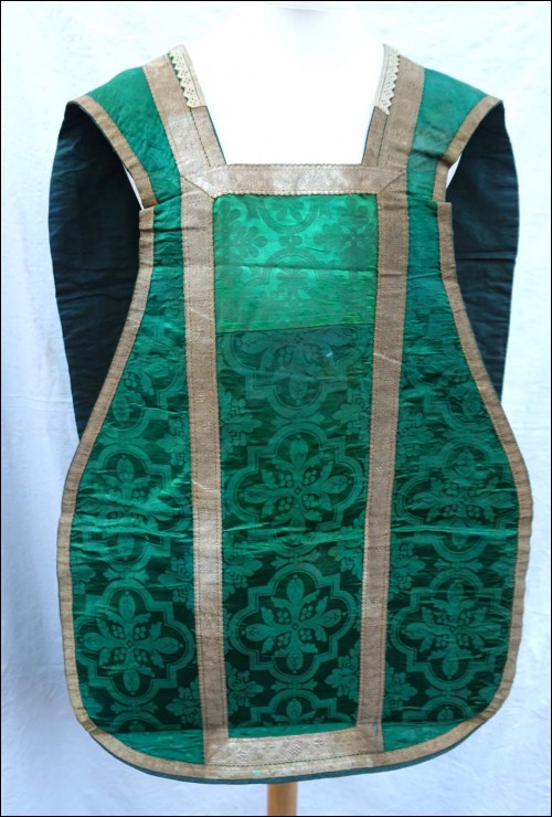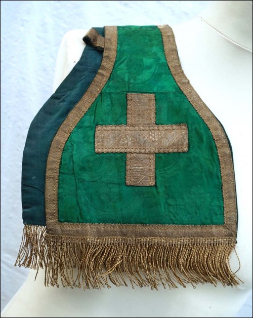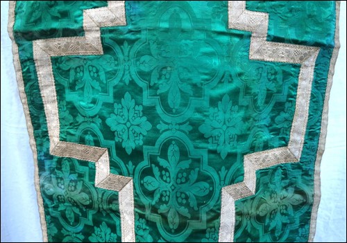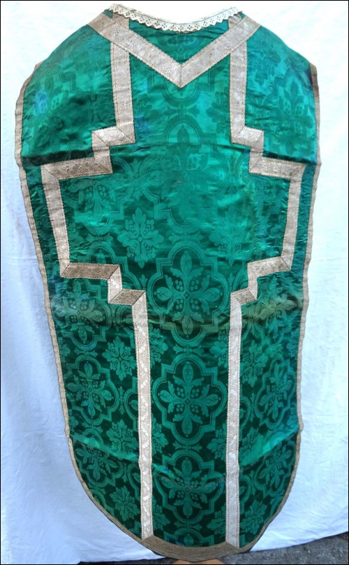 Green Damask Silk Chasuble with Maniple Silvered Braid