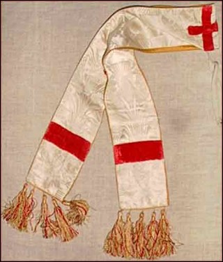 For our French-speaking friends Manipule en damassé de soie ornée de galons de velours de soie et de pompons en soie. Bon état. Hauteur 54cm.