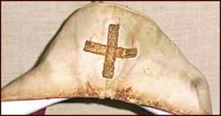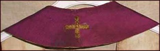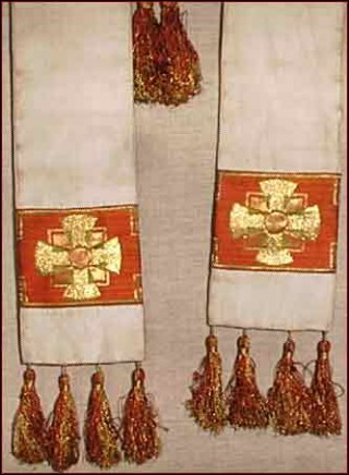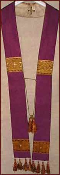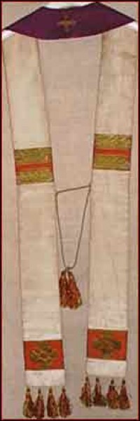 Reversible stole in violet and white silk ornate with silk braid and metallic bobbles. 33" tall. Good condition needs cleaning only small worn on the white side.
