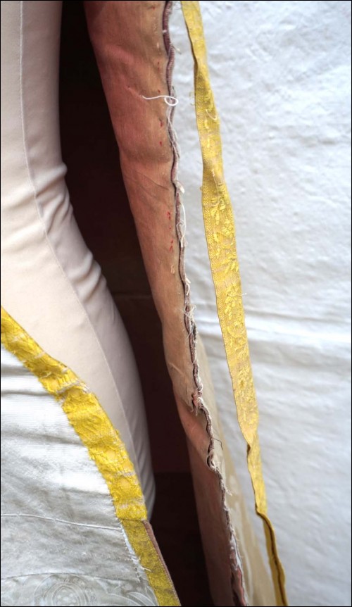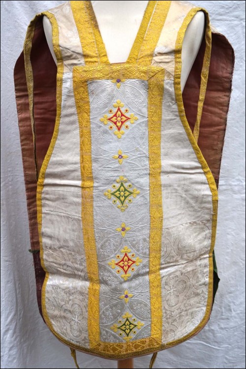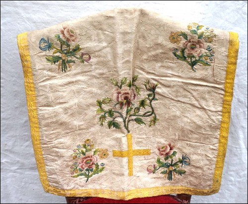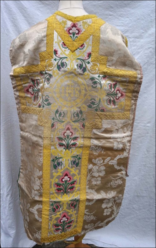 Set in white damask silk with flowered silk inlayed made up chasuble and cover chalice maade during the 18th century. On the back of chasuble cross in flowered silk with IH. 43 1/2" height. Good condition just the braid around the chasuble is ripped and the flowered damask of the cover chalice has not the same pattern as shown by the following pictures.