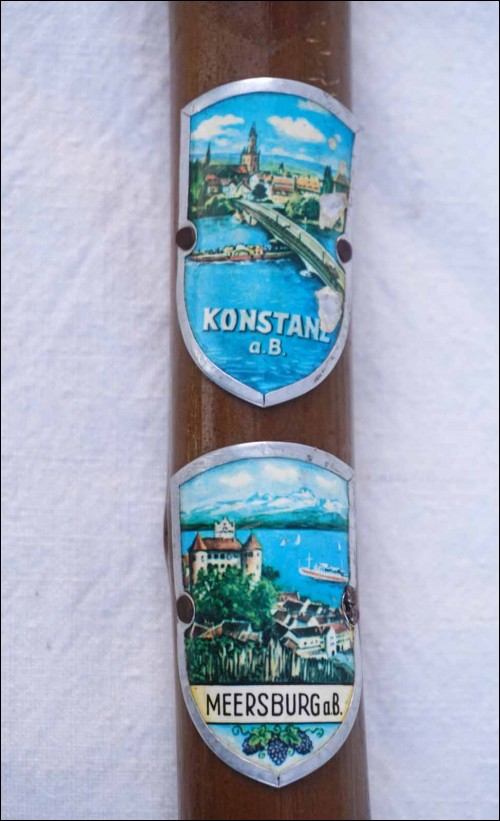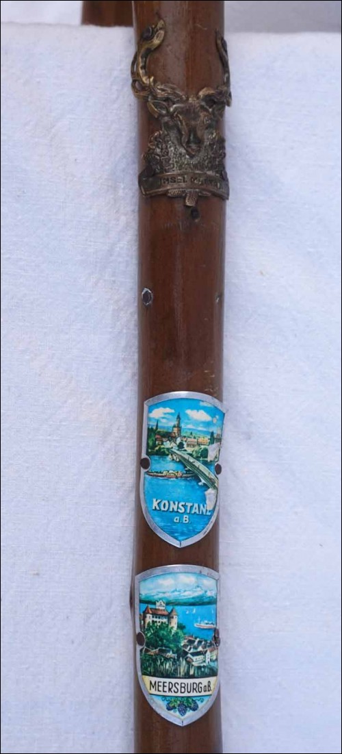 Vintage german black forest walking stick with 3 badges/ shields showing the town of Islen Mainau, Konstanz and Meersburg , made during the mid-century. 33 1/4" (84.5cm) height. Good condition as shown by the following pictures.