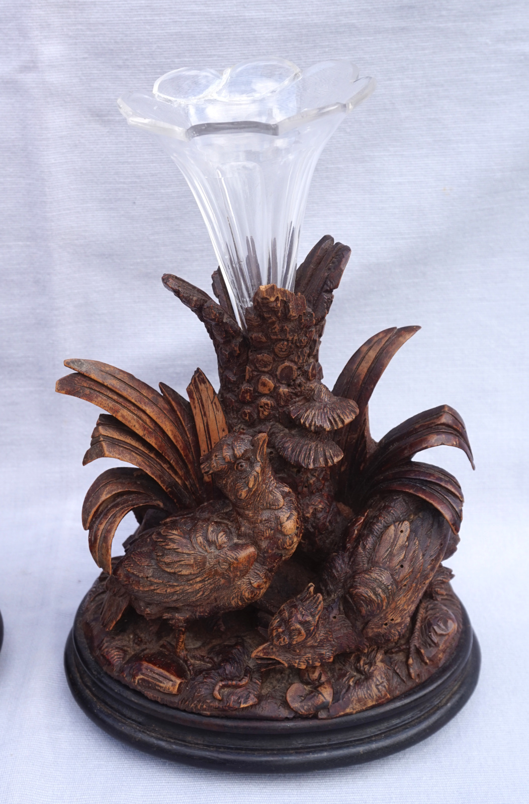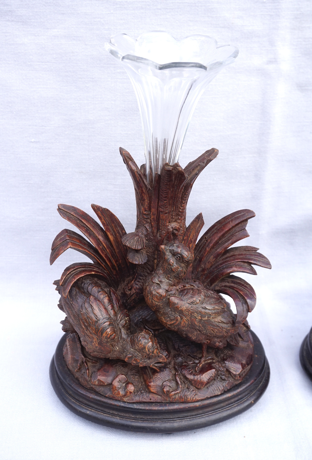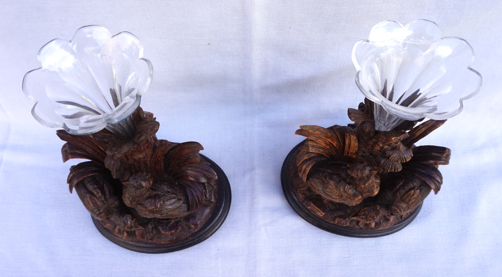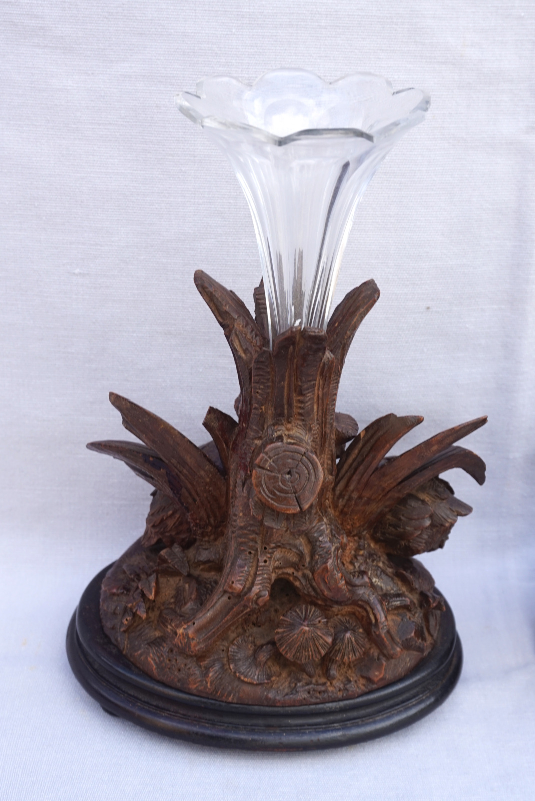 French black forest carved nut wood base with cut crystal epergne pair vase made late 19th century. The base show partridges and foliage. 10" (25.5cm) total height, 6 7/8" (17.5cm) width, 5 1/4" (13.5cm) depth, weight for the pair 3lb 3oz (1.458kilograms). Good condition for the wood carved base (some holes), for the cut crystal epergne one cut and glued.