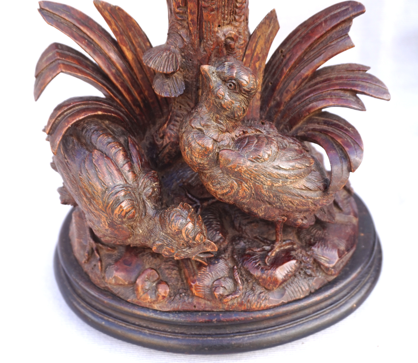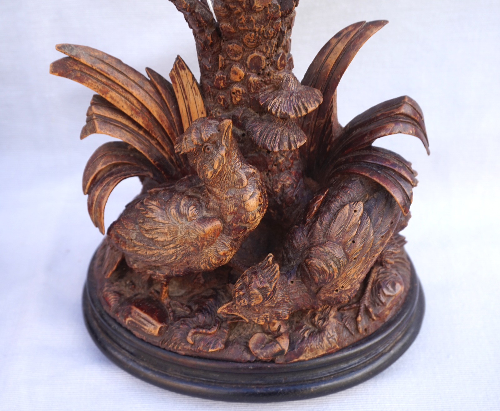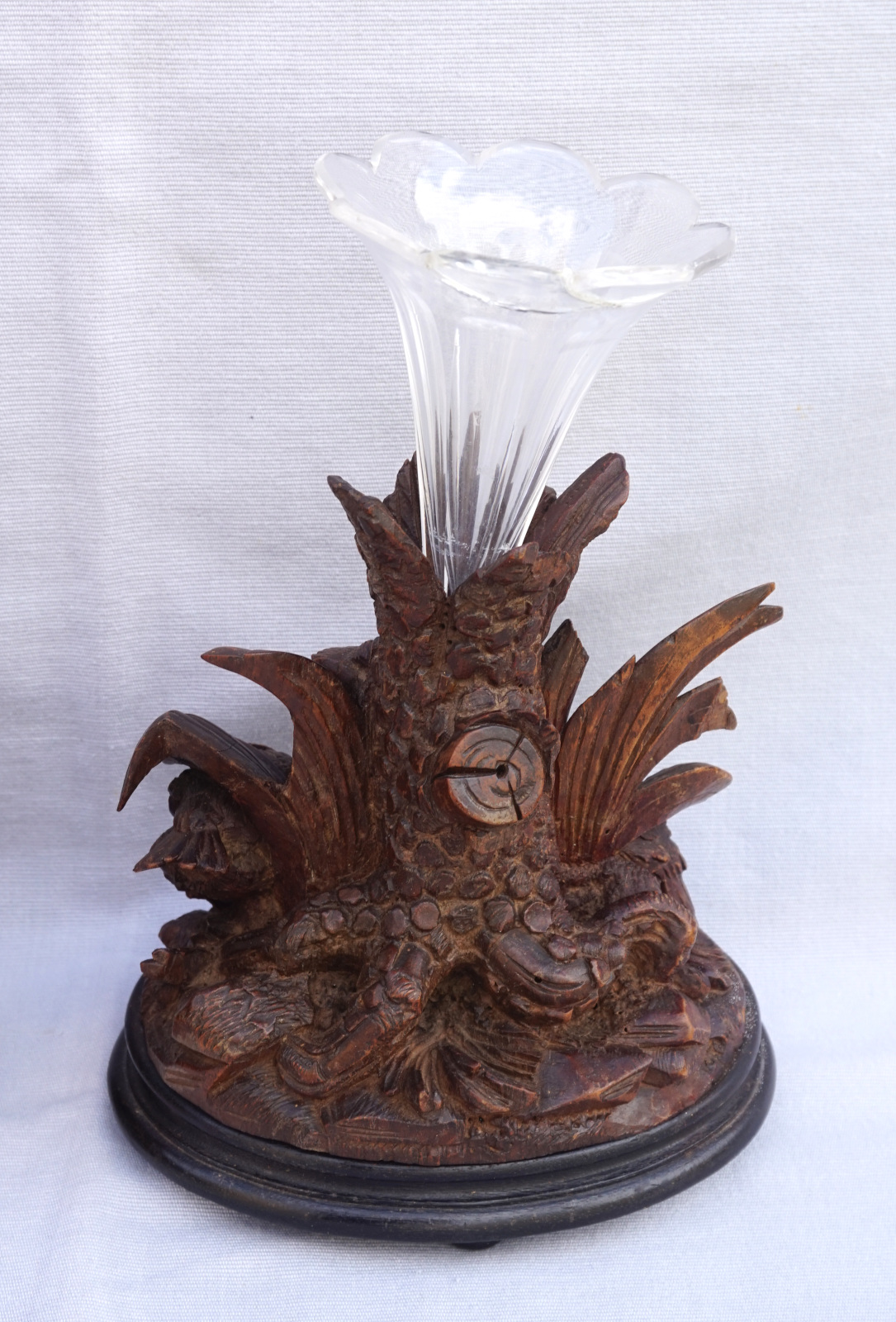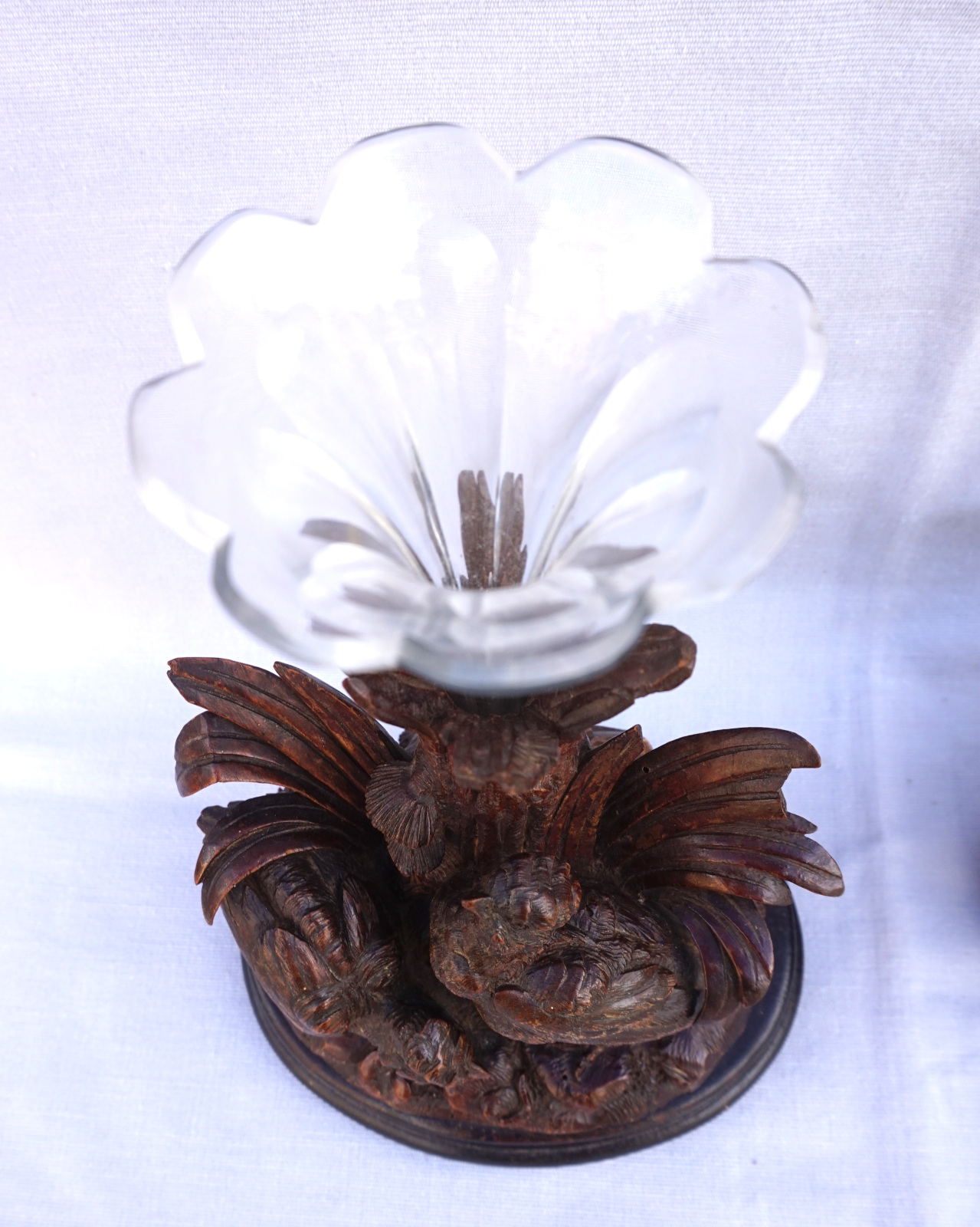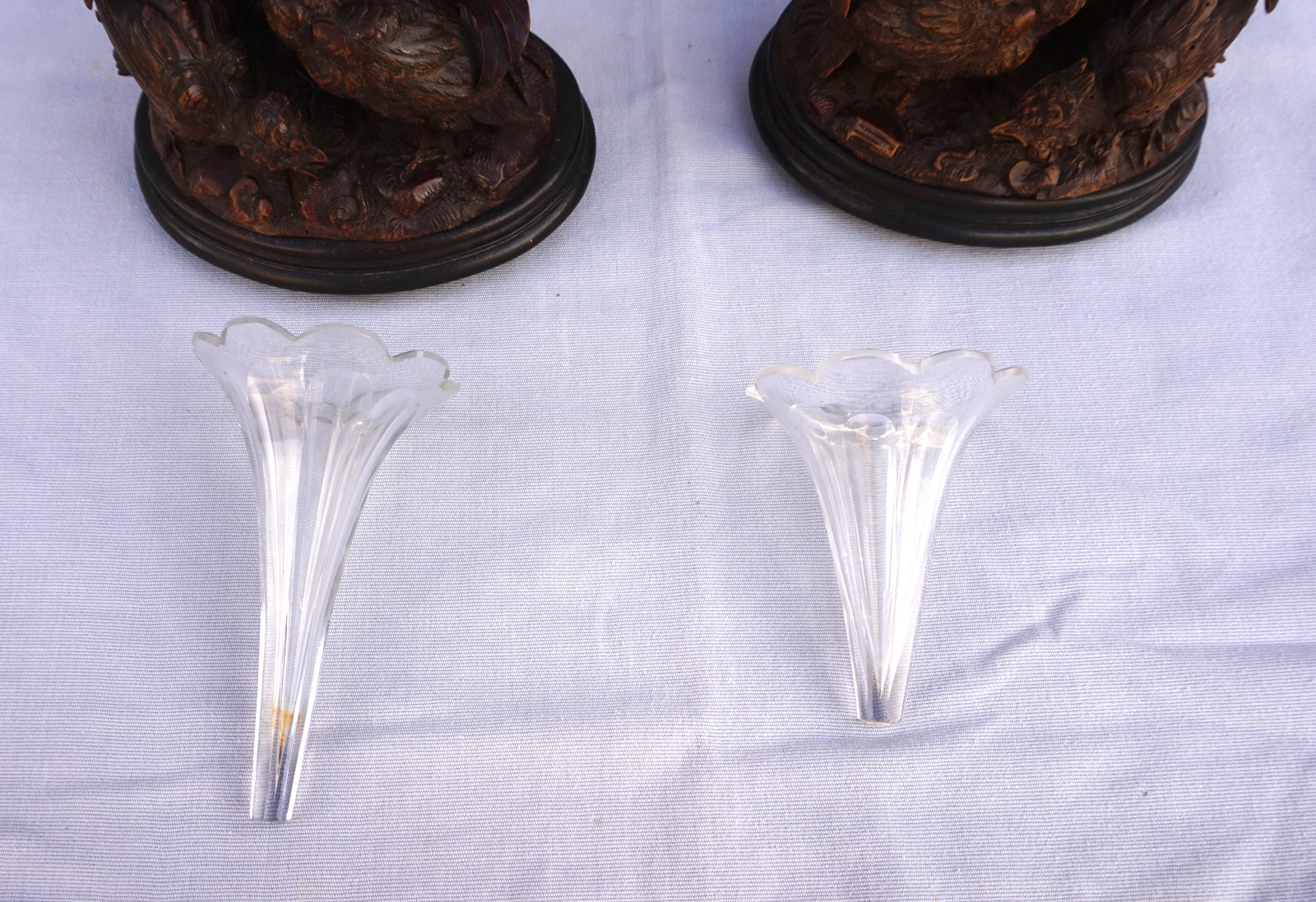 French black forest carved nut wood base with cut crystal epergne pair vase made late 19th century. The base show partridges and foliage. 10" (25.5cm) total height, 6 7/8" (17.5cm) width, 5 1/4" (13.5cm) depth, weight for the pair 3lb 3oz (1.458kilograms). Good condition for the wood carved base (some holes), for the cut crystal epergne one cut and glued.