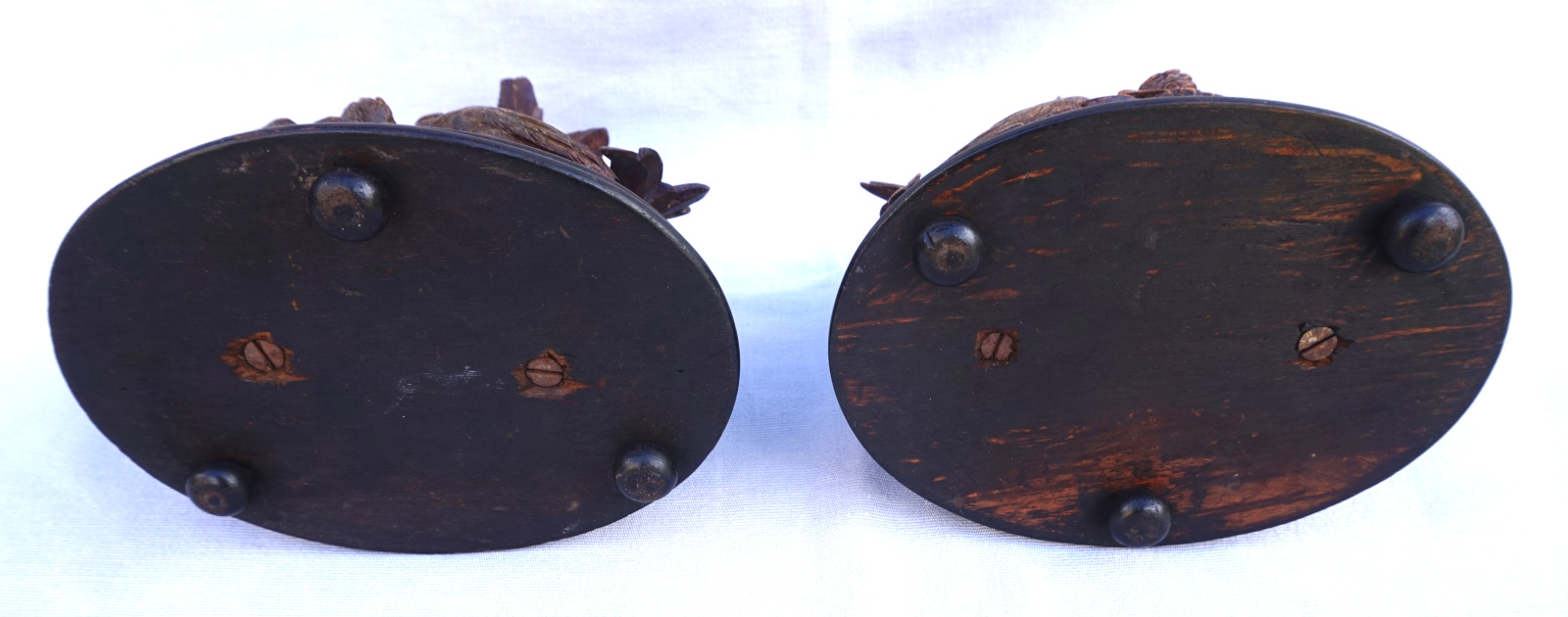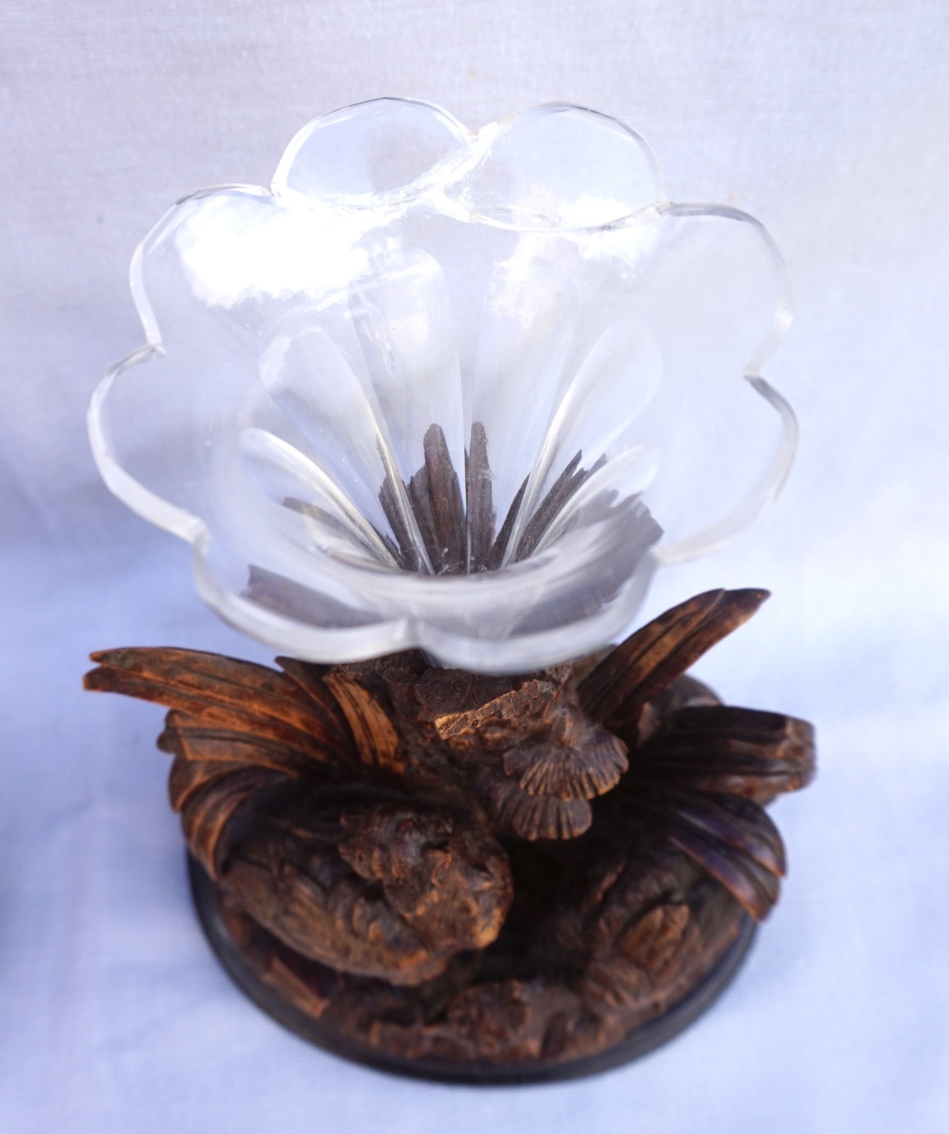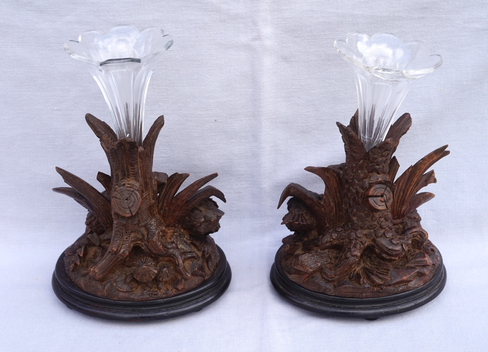 Black Forest Carved Wood Base Crystal Vase Epergne Pair 19th C