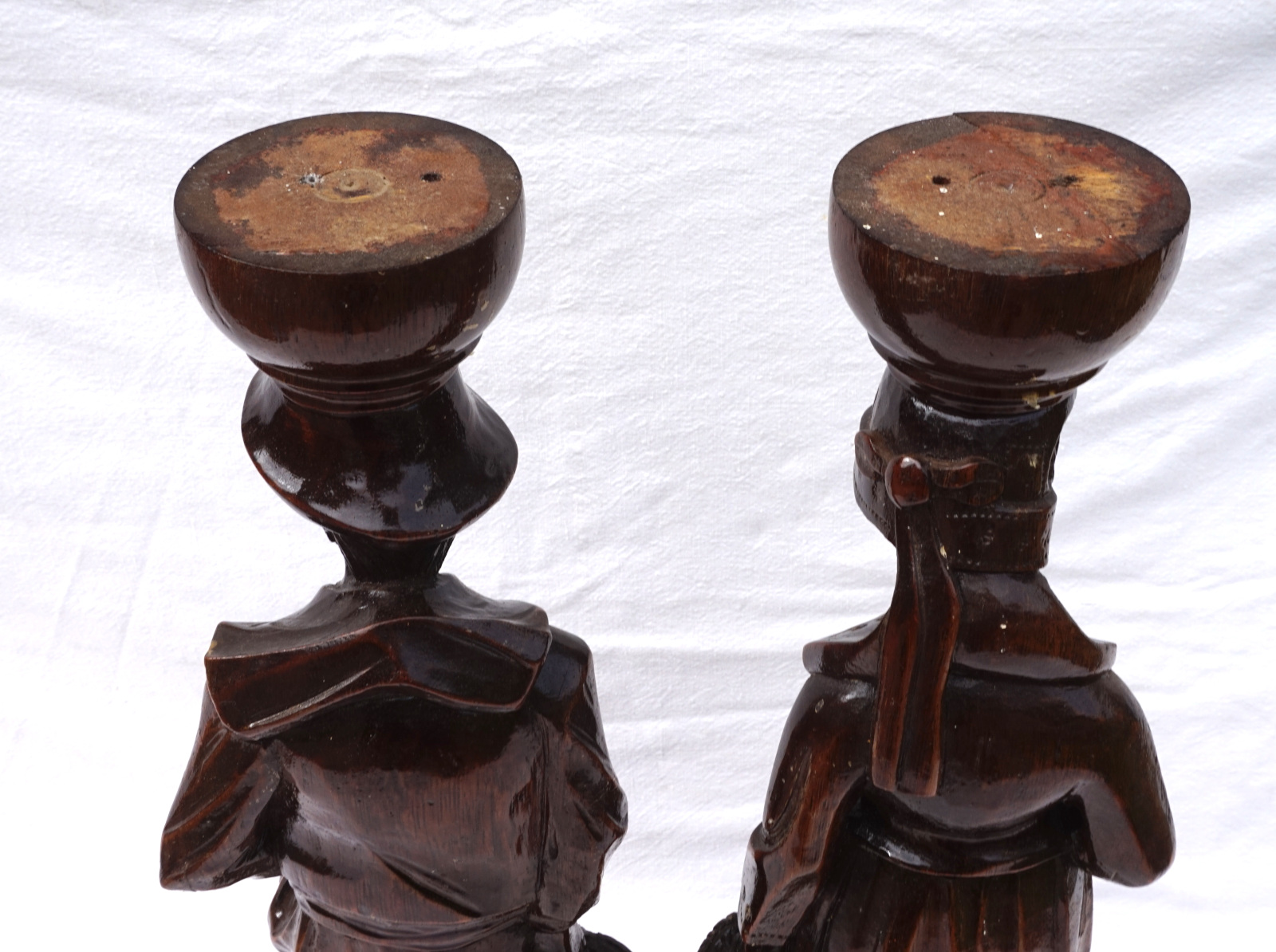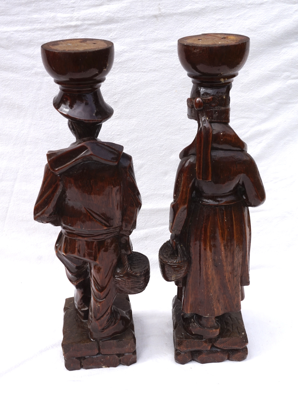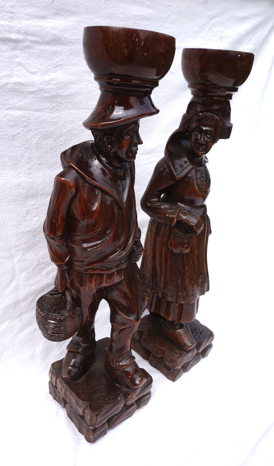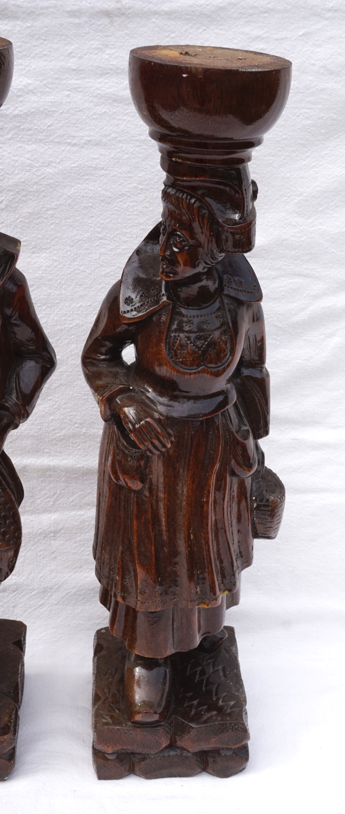 French couple of bretons coming back of fishing or market in wood carved made near Quimper during the mid-century. 191/4" (49cm) height, 4 1/4" (10.7cm) width, 4 1/2" (11.5cm) depth, weight 9lb 4oz (4.2 kilograms) for the couple. Perfect condition.