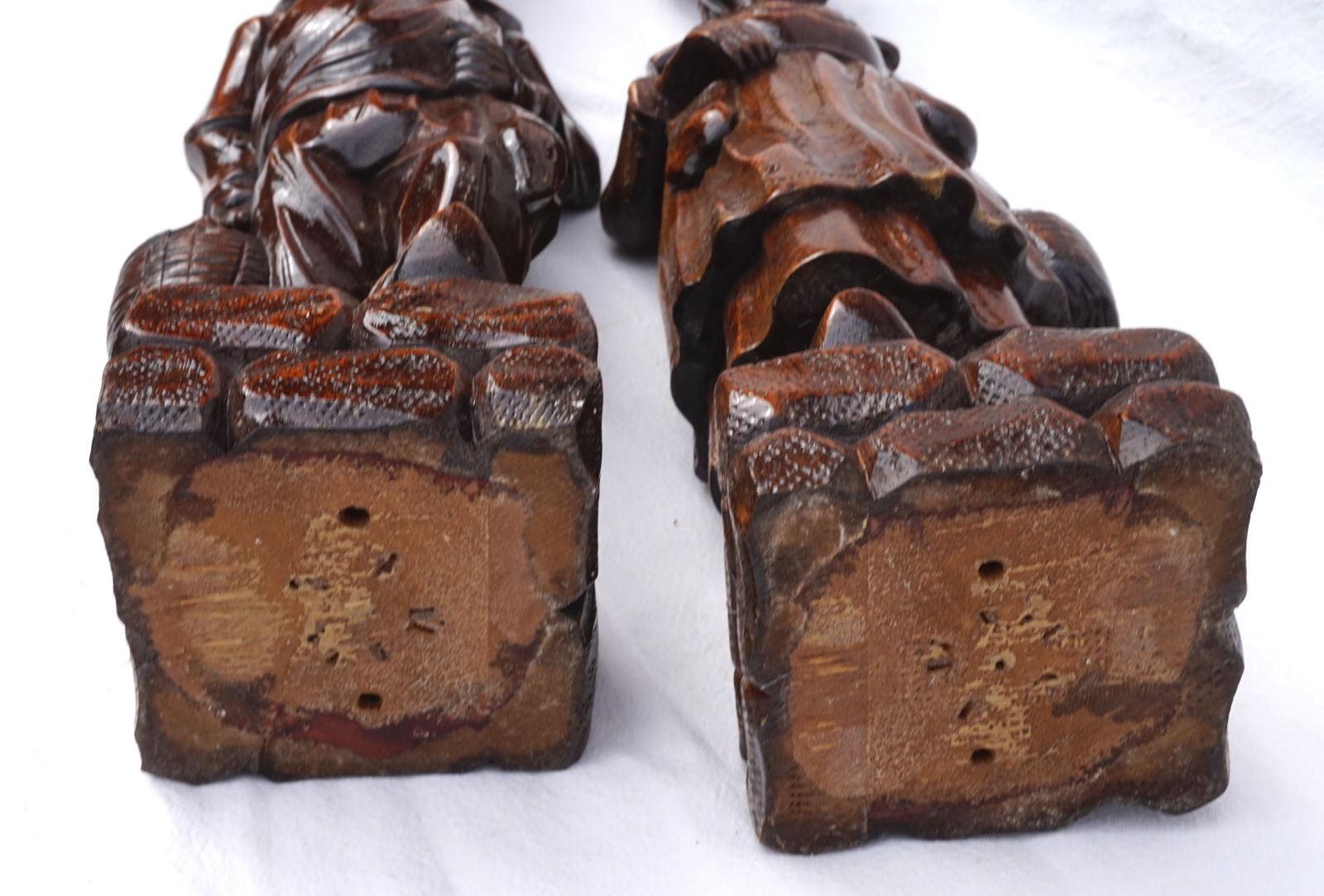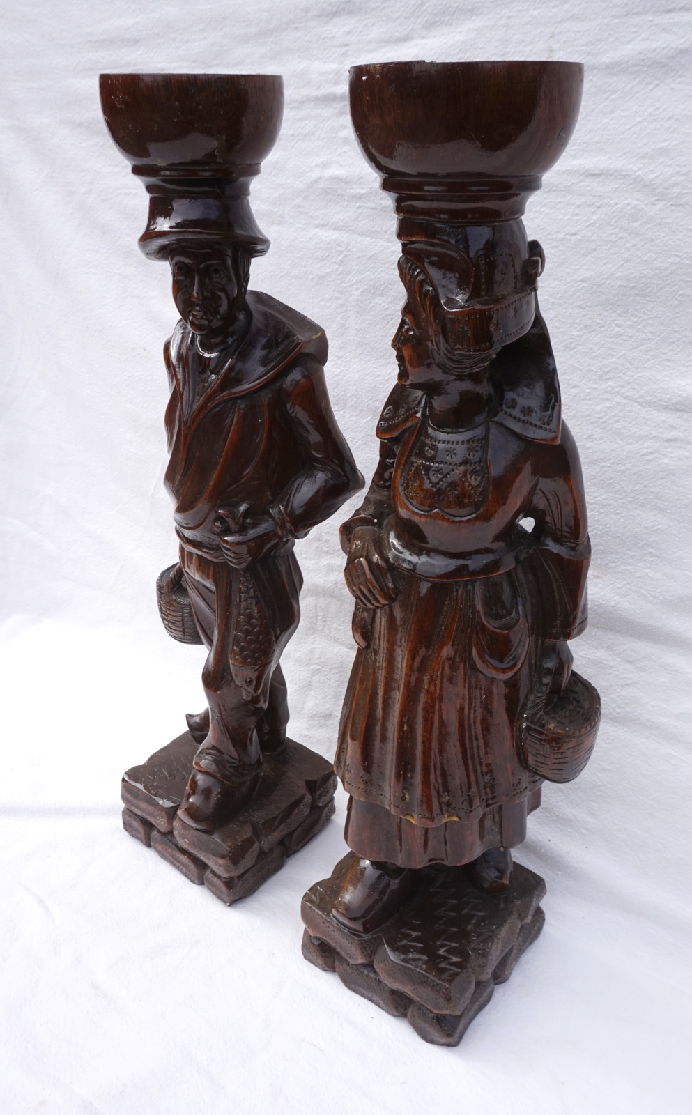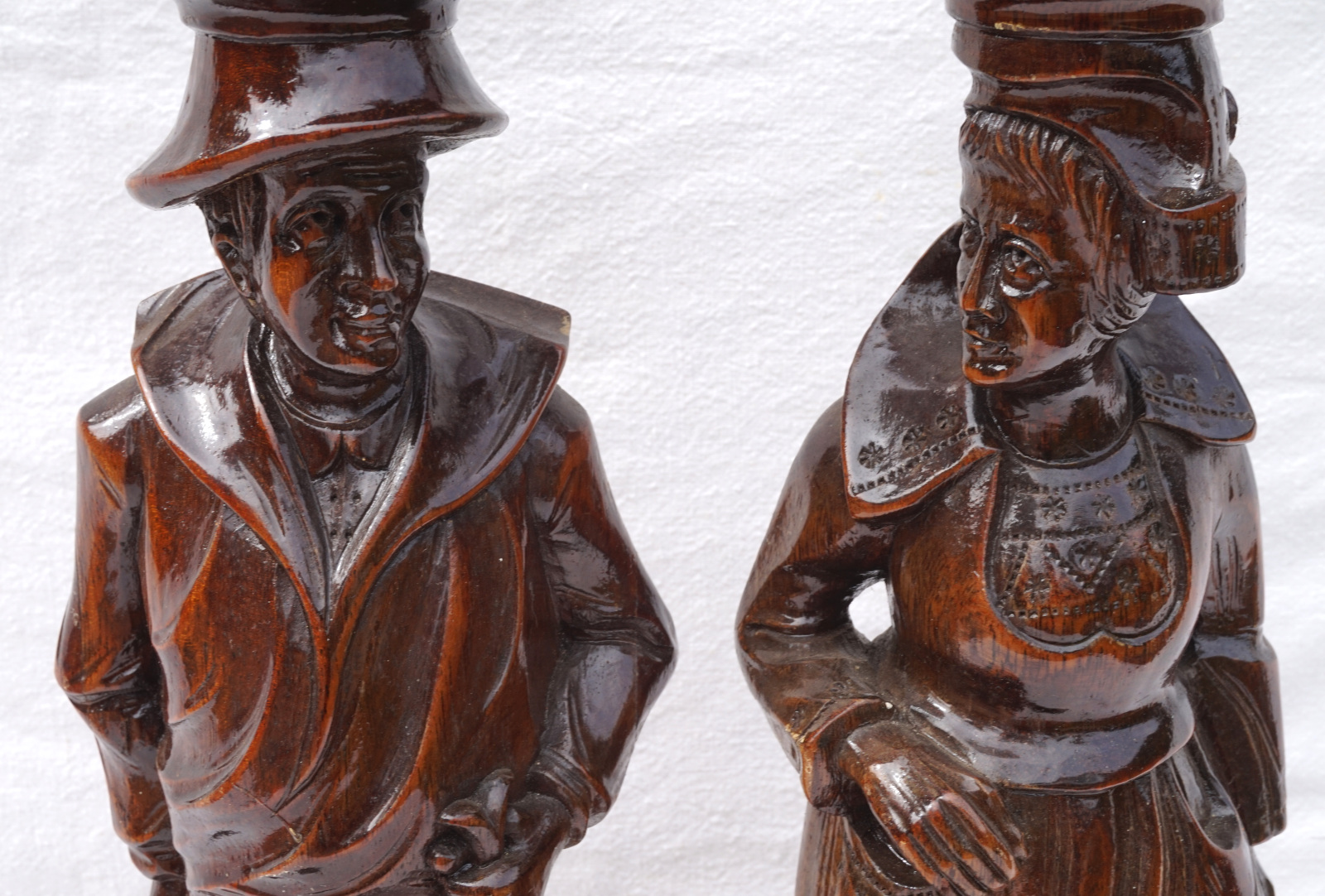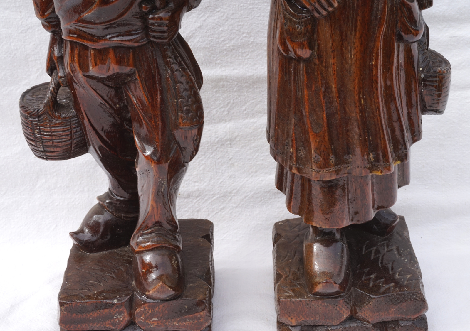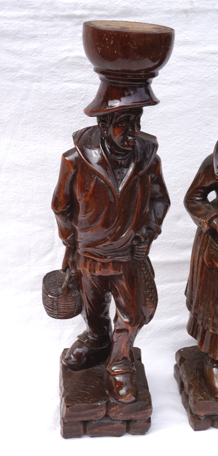 Couple de breton en bois sculpté revenant de la pêche, milieu XX° siècle. Hauteur 49 cm, largeur 10.7 cm, profondeur 11.5 cm. Très bel état