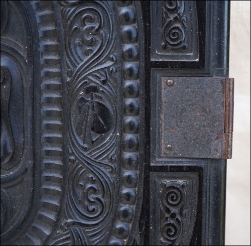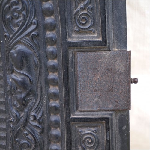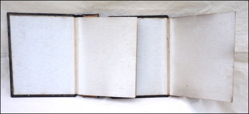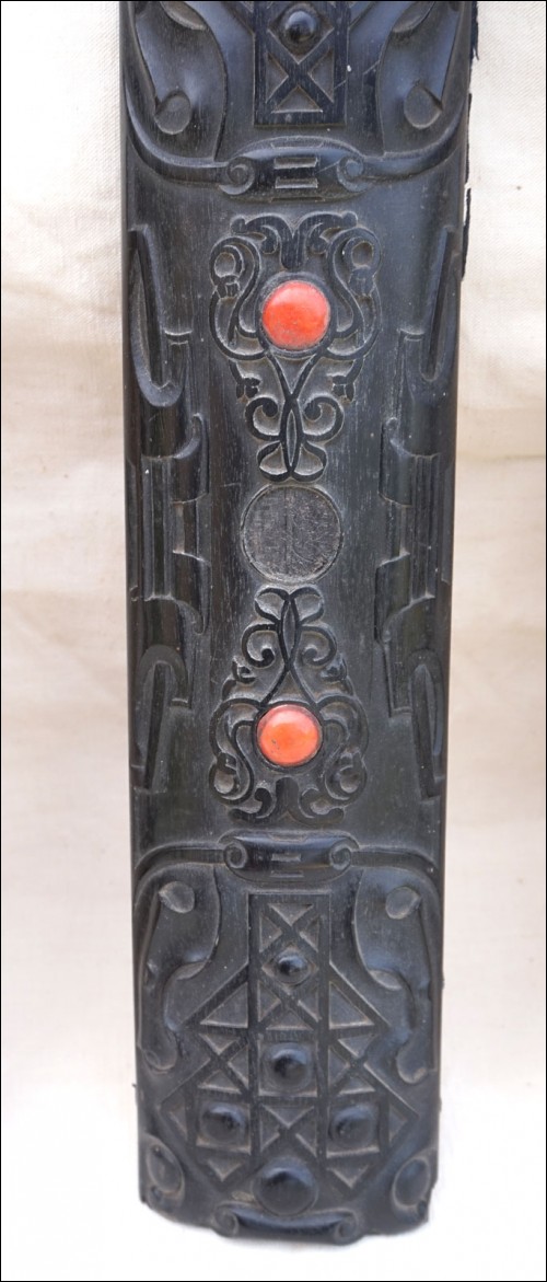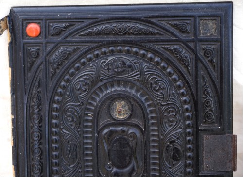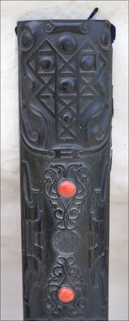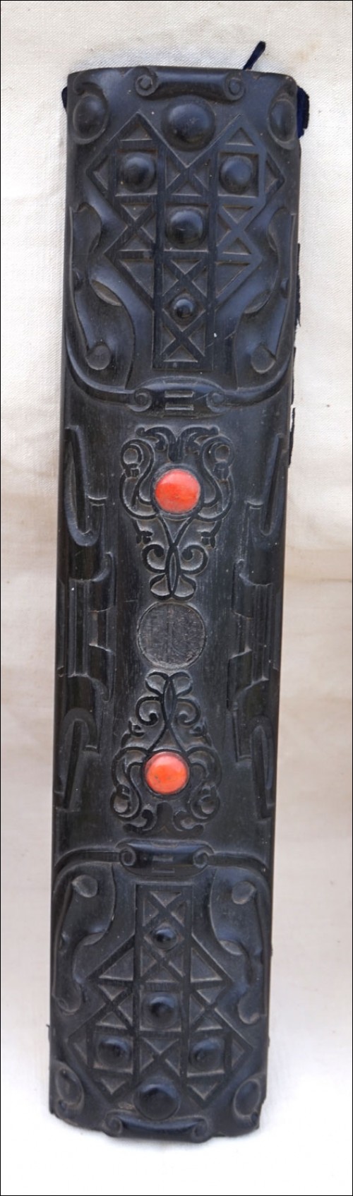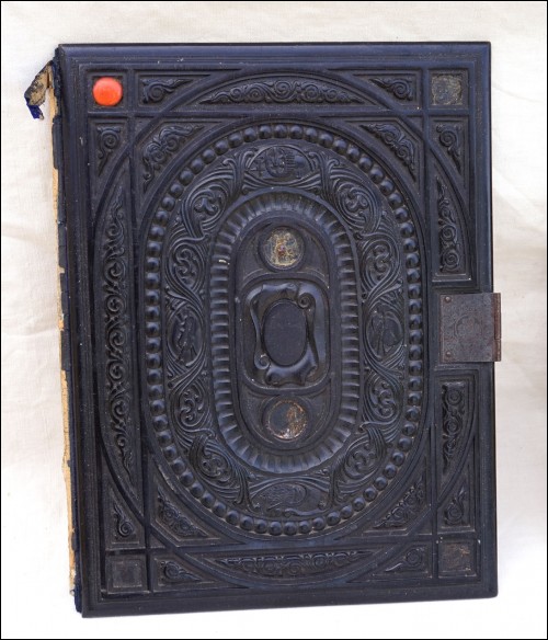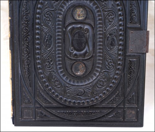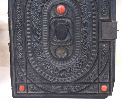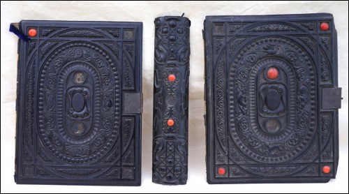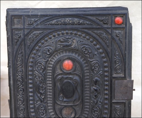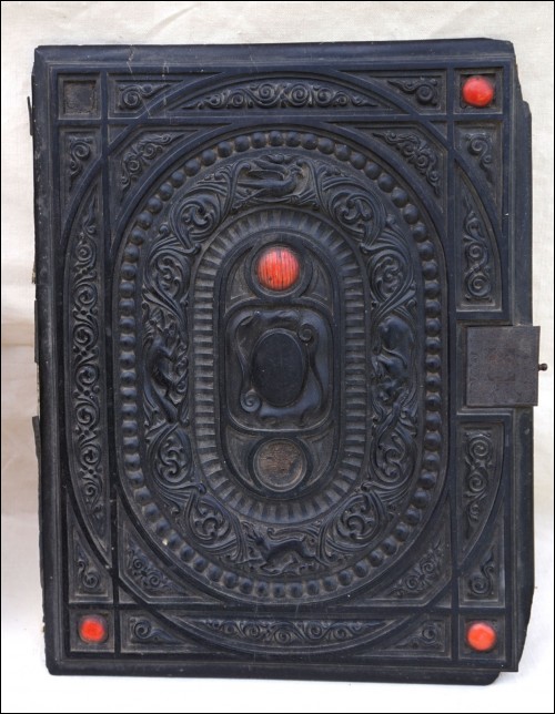 Antique carved gutta percha inlayed with coral cabochons binding with engraved lock made during the 1880's.The carved ebony binding is not in perfect condition a few coral caochons are missing as you can see on the pictures below. 12 7/8" height 9 5/8" width 2 5/8" depth (width of the back part) weight 4lb 0.692oz (1.834kilograms).