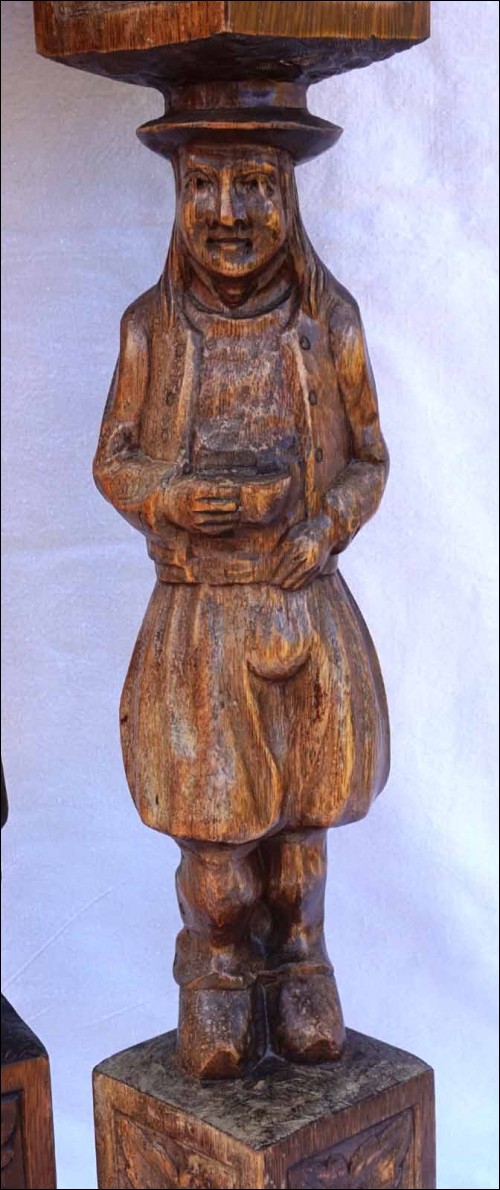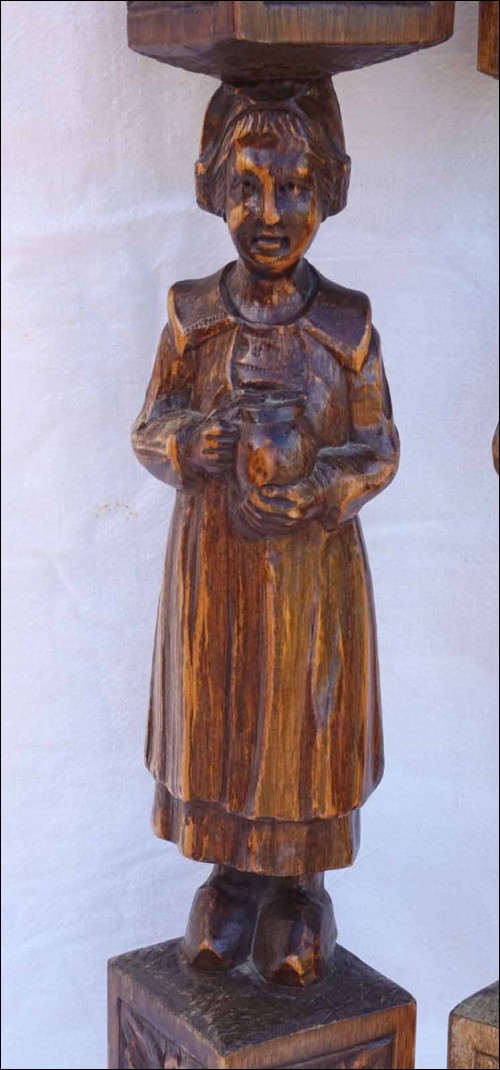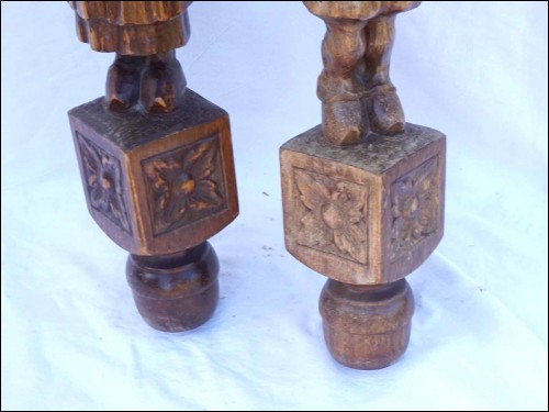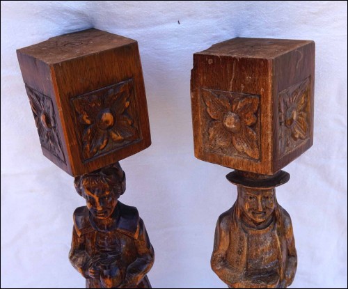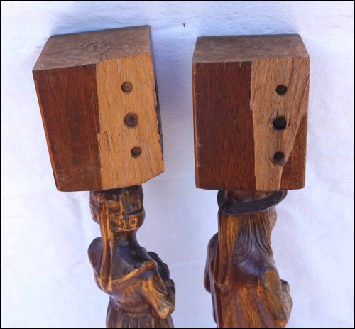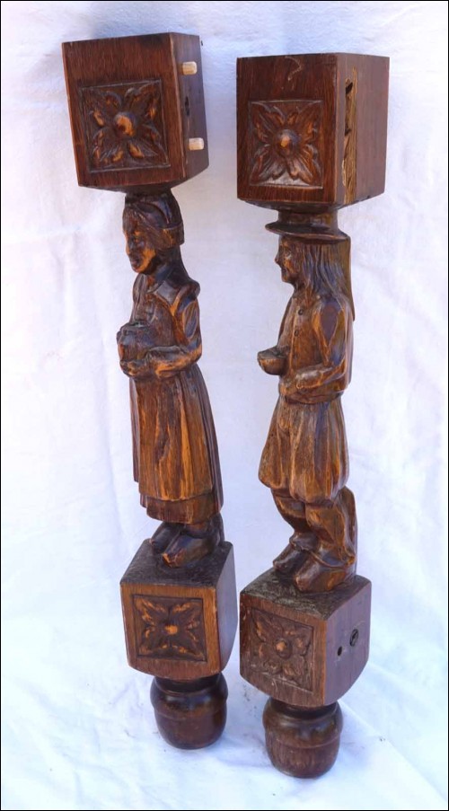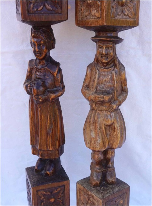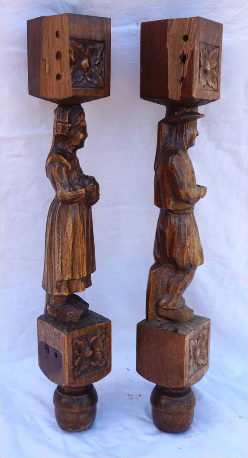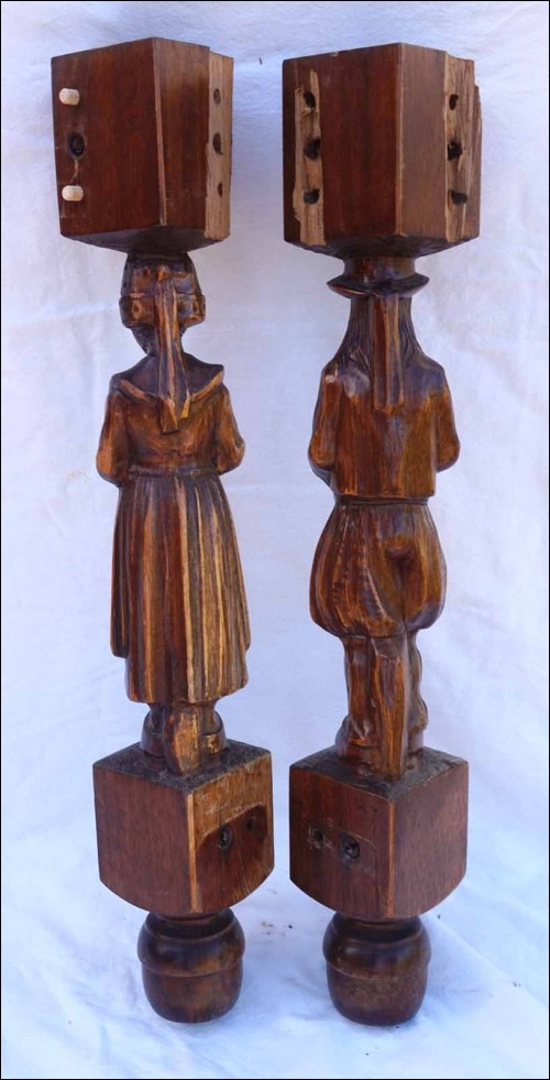 French wood carved couple of Bretons balusters made near Quimper Brittany during the first half of the 20th century. 29" (73.7cm) total height, 15 1/2" (39.2cm) figure height, 3 7/8" (10cm) by side, weight 13lbs for the pair. Good condition for the figures the man as somme water stains, damages to the top of the balusters as shown by the following pictures.