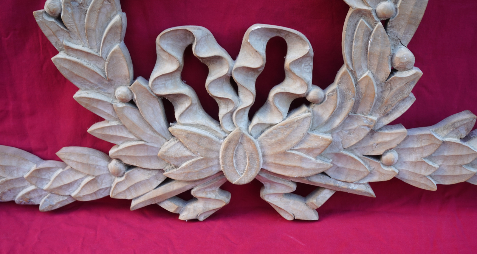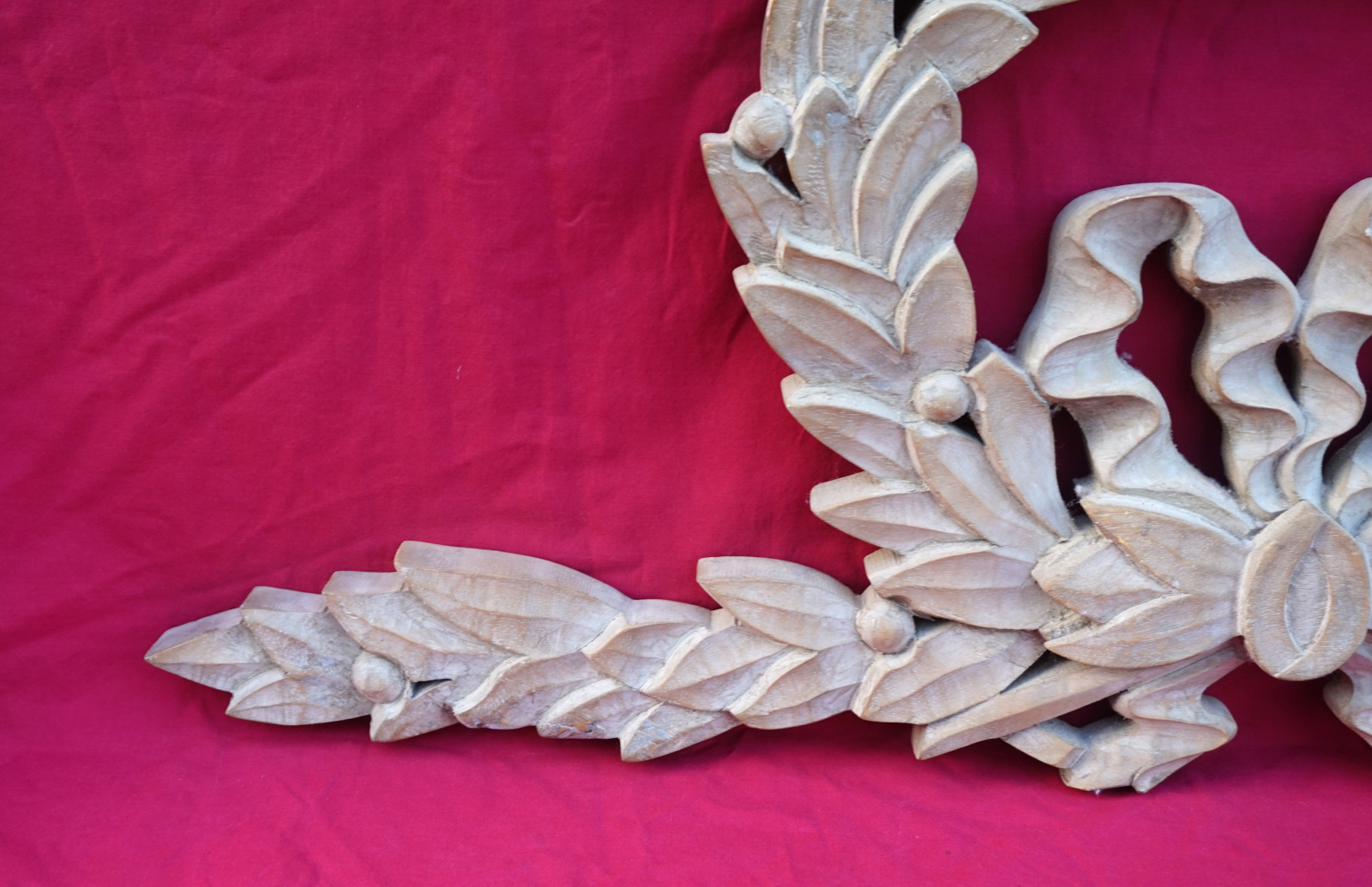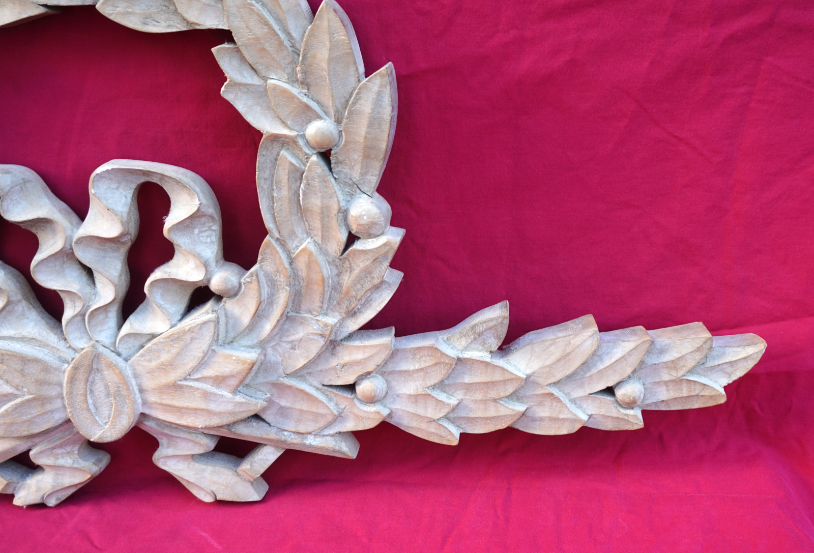 Antique french carved wood Louis XVI style pediment with laurel wreath and ribbon made early 20th century. 28 1/8" (71.5cm) length, 12 3/4" (32.5cm) height. Perfect condition with 2 fixing holes on the back