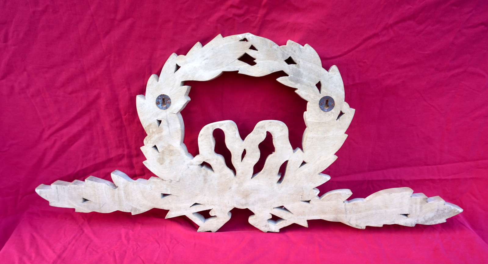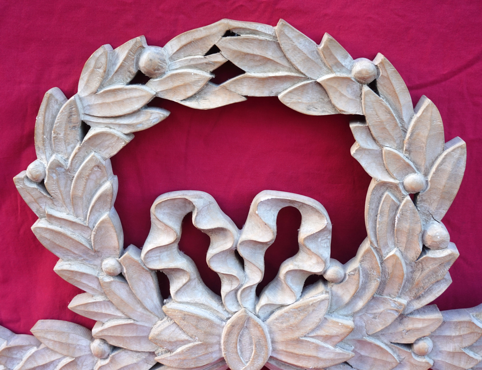 Ornement en bois à suspendre en forme de couronne de laurier et ruban, entièrement sculpté main. Largeur 71.5 cm, hauteur 32.5 cm. Très bel état avec deux encoches de suspension.